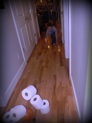 We played pumpkin bowling for one of the games at the party. The kids really liked this game. The pumpkin was the bowling ball and rolls of toilet paper that had faces on them (ghosts) were the pins. this is Zach getting a strike. I even tried it out myself. I got a spare.